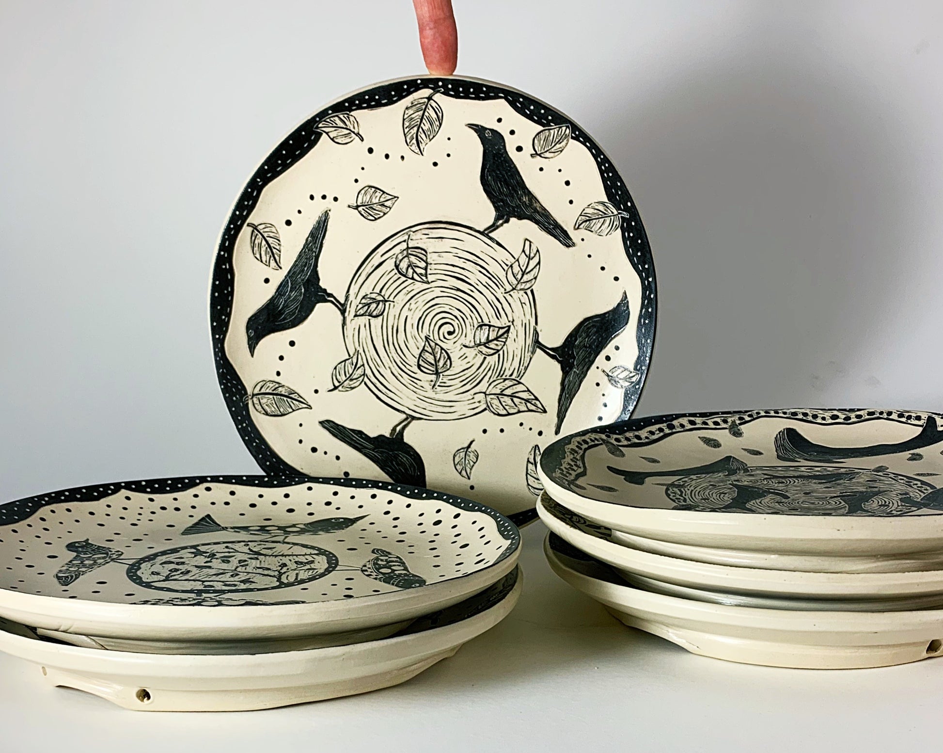 This stoneware piece is handmade and hand-etched in my woodcut-style design, using traditional sgraffito (etching) techniques in a contemporary way.