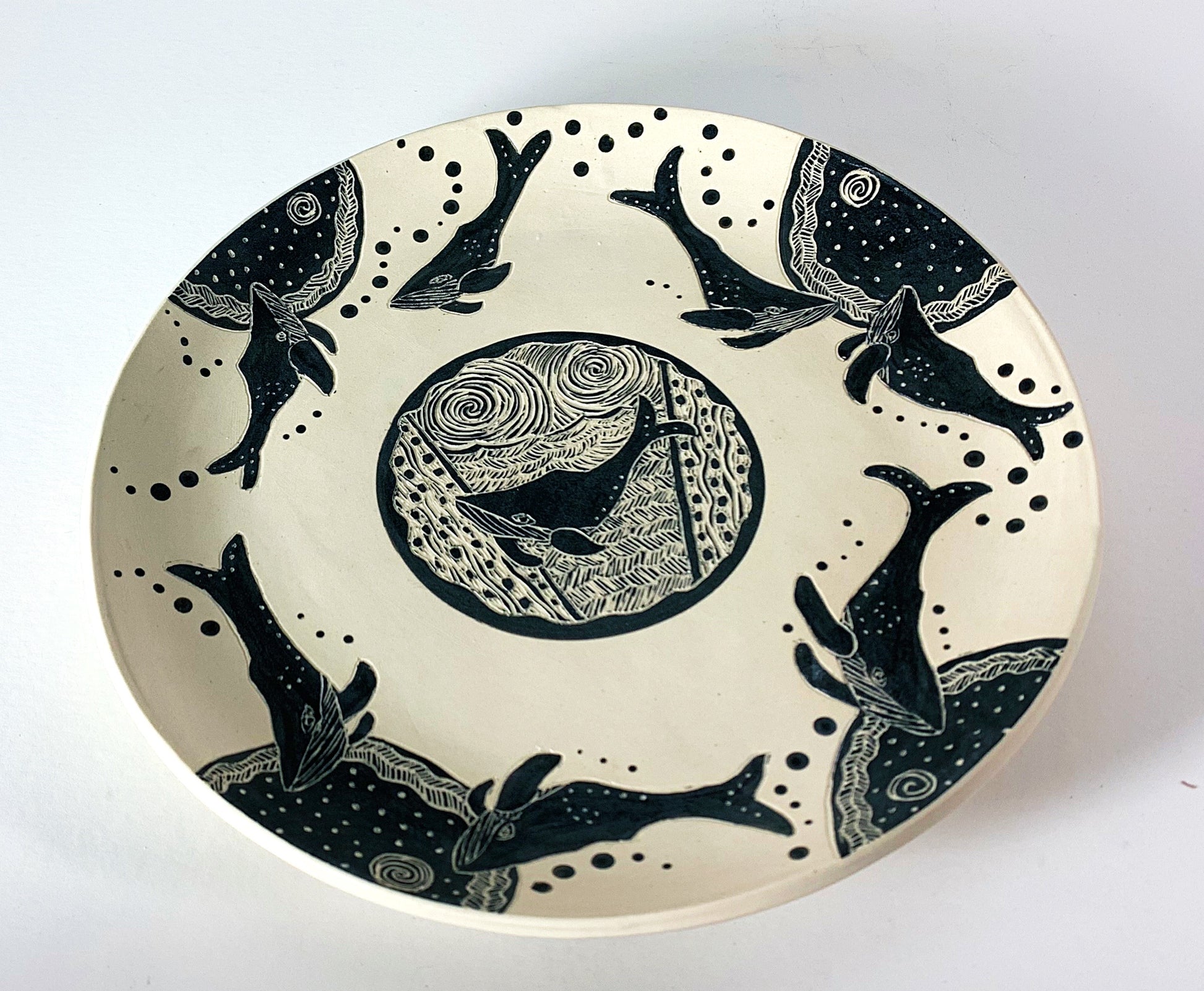A whole pod of humpback whales swim round-and-round on this plate. It is handmade and hand-etched, with a one-of-a-kind design.